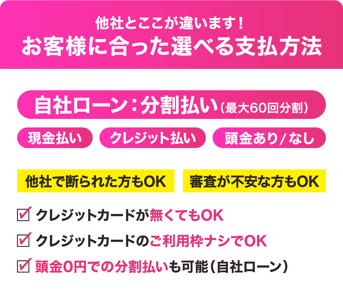 自社ローンで最大60回払いまで可能ですので、手持ちに現金がない方もクレジットカードがない方も一度ご相談くださいませ。